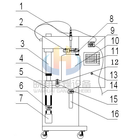 7、收集瓶;8、大卡箍; 9、蠕動泵; 10、干燥室; 11、觸摸屏;12、2 號卡箍; 13、電源開關(guān);