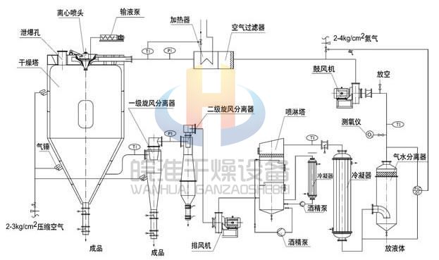 閉式循環(huán)噴霧干燥機(jī)系統(tǒng)由噴霧干燥機(jī)主機(jī)、帶空氣過(guò)濾器的加熱器、鼓風(fēng)機(jī)、水氣分離器、大小冷卻塔、噴淋塔、排風(fēng)機(jī)、一級(jí)旋風(fēng)分離器、二級(jí)旋風(fēng)分離器、泵、測(cè)氧儀以及管路與控制閥等組成。
